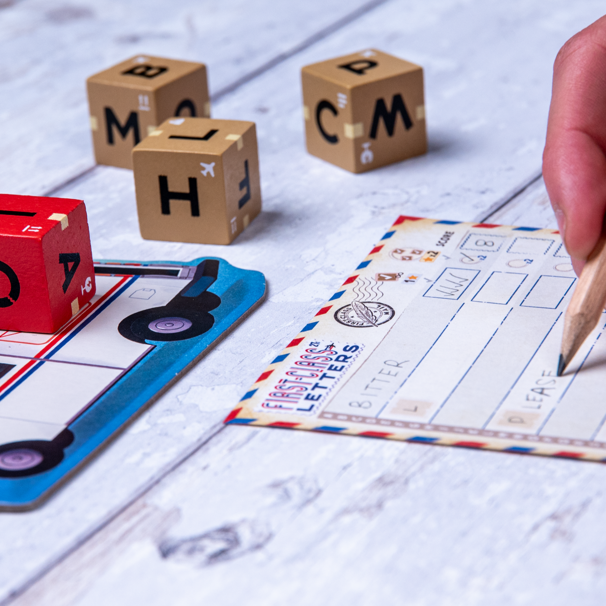First Class Letters is a roll-and-write word game played over 7 rounds. Each round players write a word on their sheet using letters rolled on dice, as much as they can. The words on their sheet must be kept in alphabetical order, or be cancelled out!
