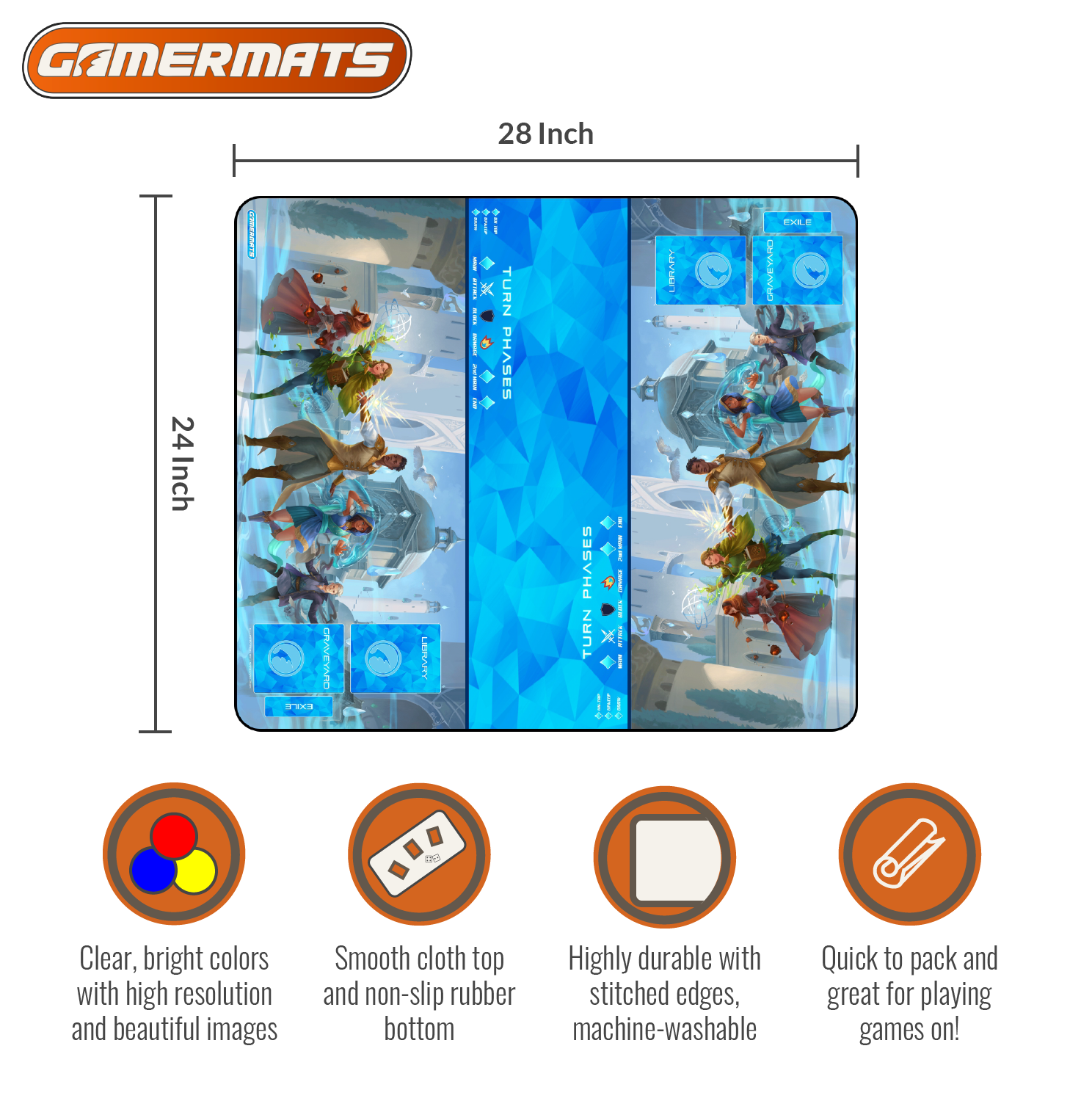 GamerMats XL PLAYMATS are designed with you and your favorite card games in mind. Use this two player mat to help keep your game organized. Made with a smooth cloth top and durable rubber bottom, your cards will move easily, but your mat will not. When it comes to playmats, GamerMats is the name for variety, quality and care!