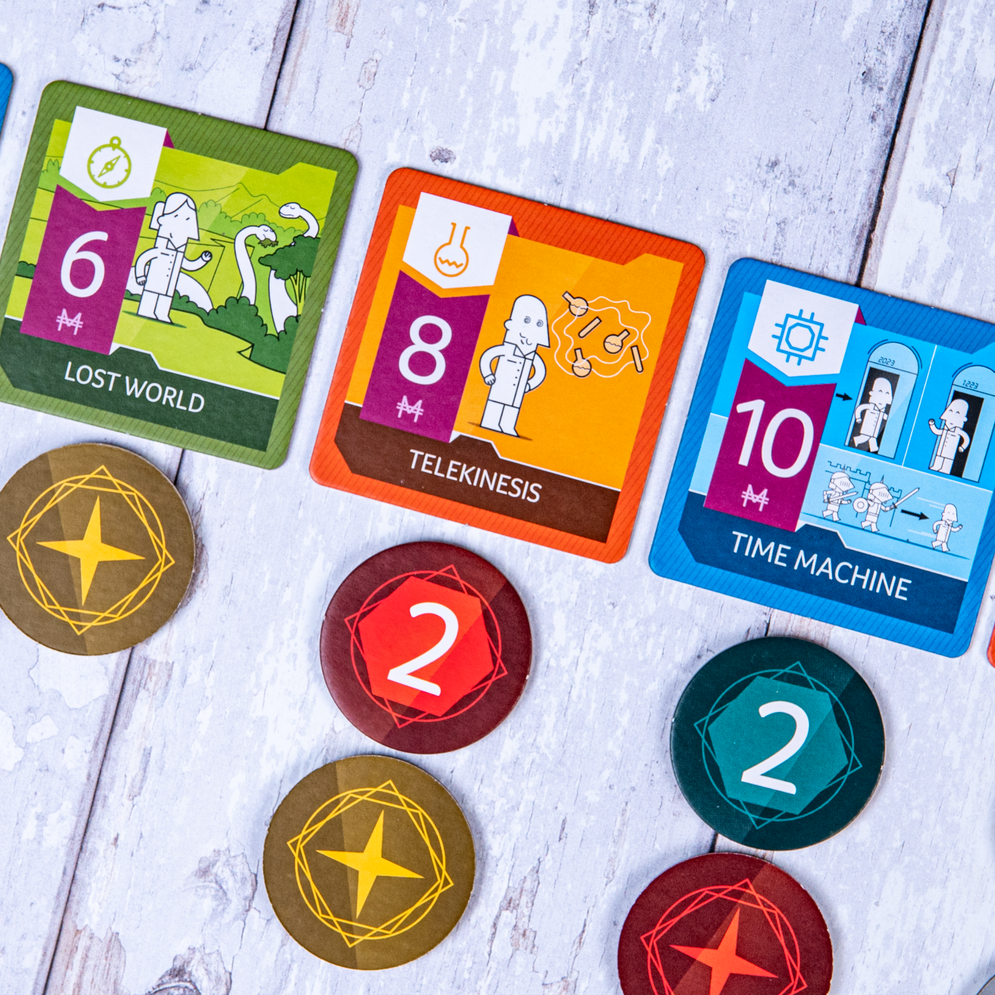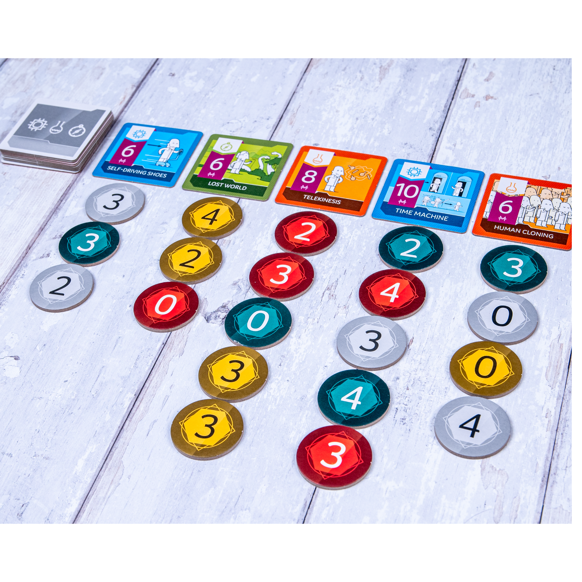 In each round, appealing but risky ventures rise. Sort out pessimistic or frothy ventures from the good ones and invest in them secretly. At the end of each round, reveal the secret biddings and see which ventures have earned enough investment. Investors who made the most noticeable investment in them will be rewarded for their contributions to its success. The investor with the most fame at the end of the game becomes the Venture Angel.