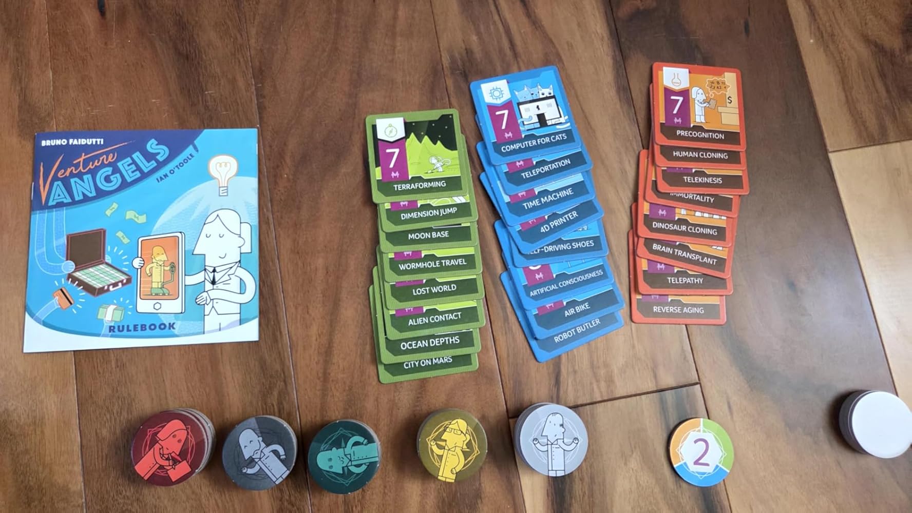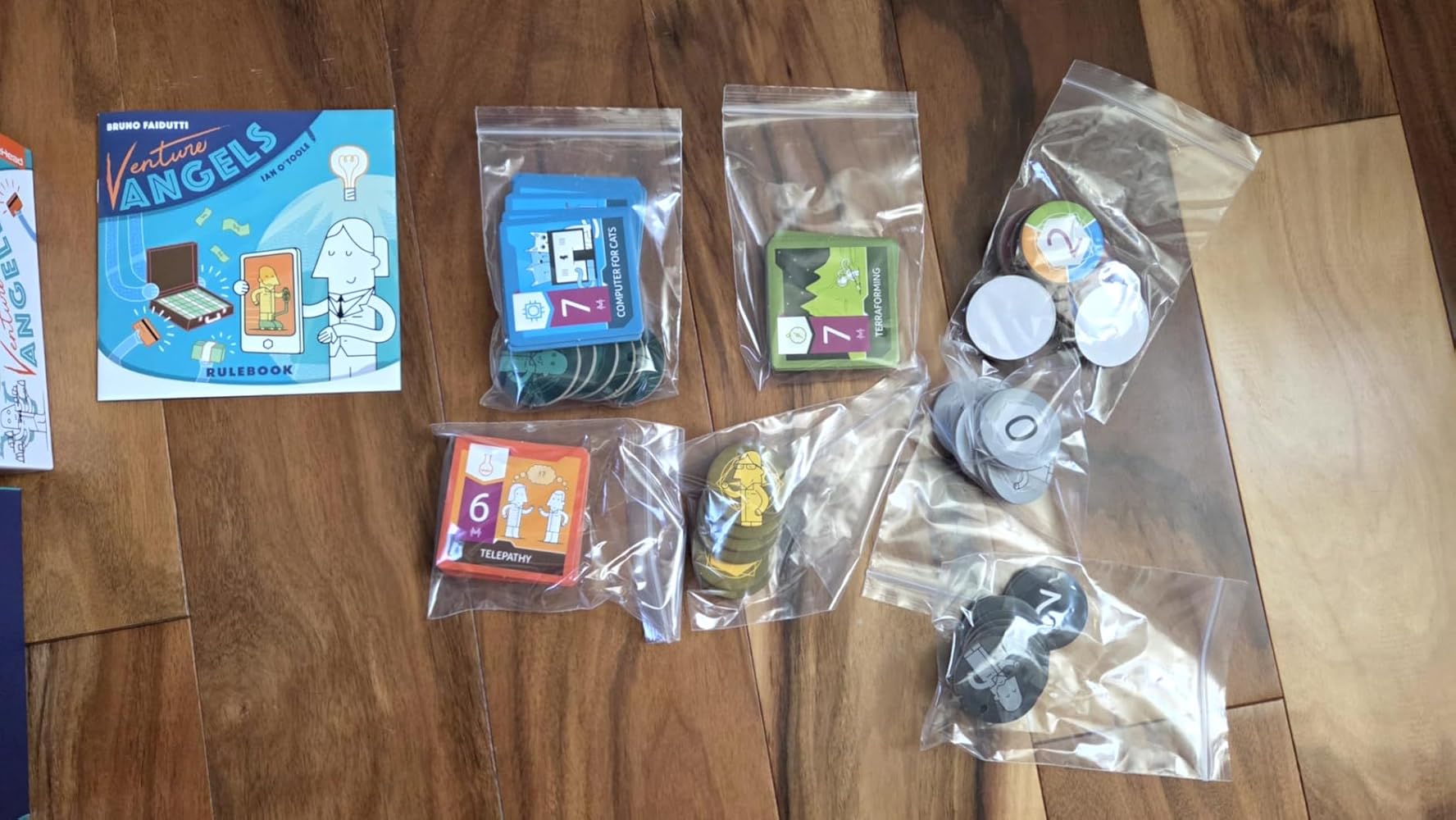 Venture Angels is a game of double think, trying to get into the heads of other players guessing and double guessing. Yes of course there's some randomness here, but it's so satisfying when you make the right moves and outsmart the rest of the table! This game is light and breezy, but there's always exciting and unexpected moments. It's really easy to teach and has been a blast with every group. I've tried it with, both gamers and non-gamers.